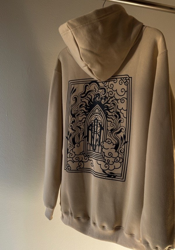 Este buzo en tono arena, presenta una ilustración que representa un portal entre nubes y el sol, símbolo de la búsqueda de algo más allá de lo material.